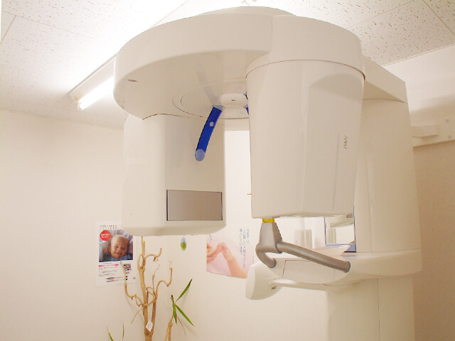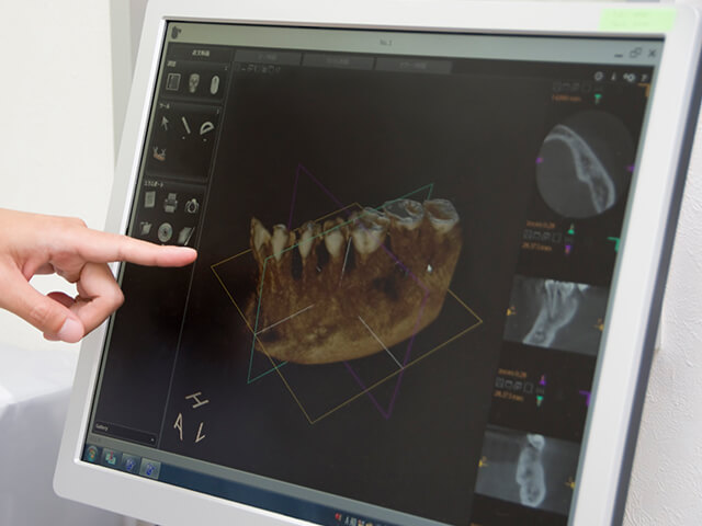 従来のレントゲンは2次元でどうしても隠れて見えない部分があり、診断に限界があります。CTは立体的で精密な3次元の画像を得ることができます。インプラント治療で必要になる骨の診断、親知らずの位置、根の先の病気、矯正治療、腫瘍など、お口の中の色々な病気の詳細な分析、正確な診断が可能です。